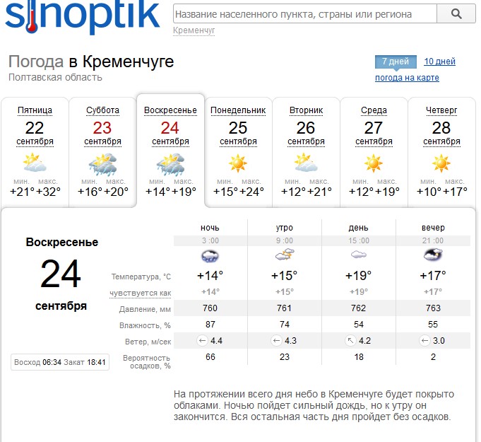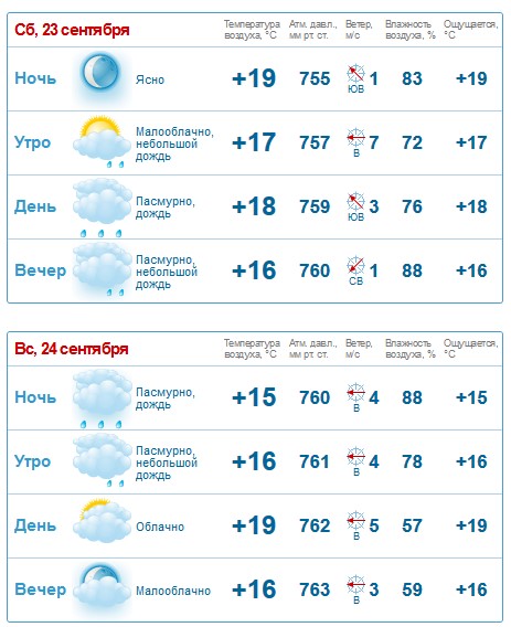В воскресенье, 24 сентября, по их прогнозу, будет сухо, но солнце всё равно весь день будет спрятано за тучами.