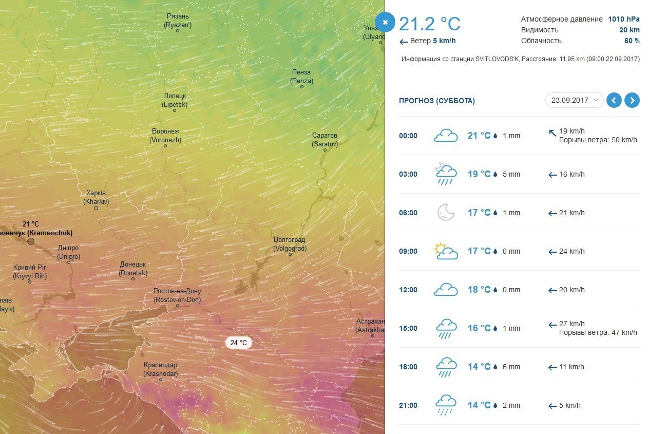 На Rp5 прогноз теплее – до +20ºС…+21ºС. Также тут кременчужан предупреждают о сильном ветре с порывами до 14 м/с.