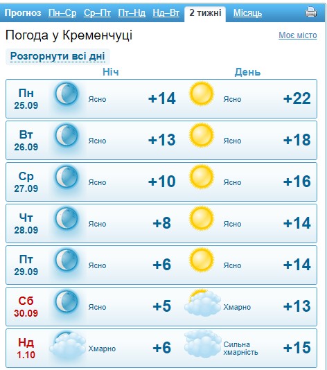 С 25 сентября по 1 октября осадков в Кременчуге не предвидится, обещают синоптики.