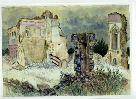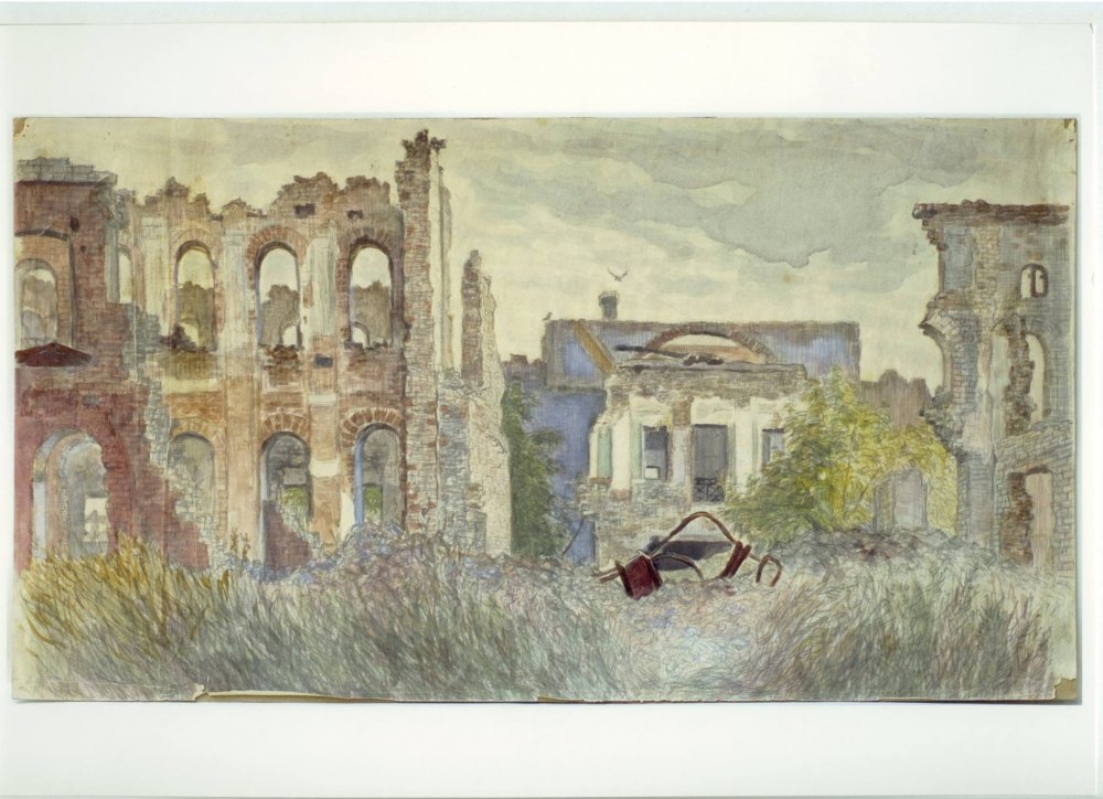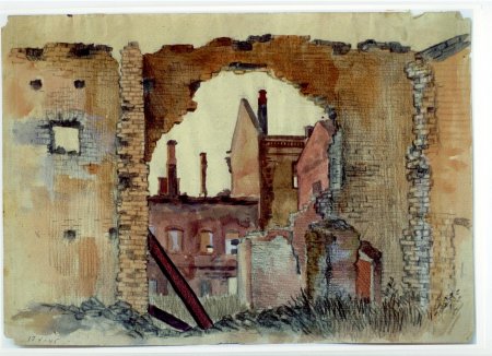 Кременчук за ступенем і характером руйнувань був одним з найбільш постраждалих в роки Другої світової війни міст Європи. Впевнитись у цьому можна, переглянувши кадри фронтової кінохроніки, яку всі бачили; документальні фото (2, 3 – будівля нинішнього музею; 4 – Народна аудиторія, 5 – школа на вул. Красіна), а також малюнки кременчужанки Лідії Литвиненко (мал. 6 - «А жити треба!», 7 – «Міськвиконком», 8 – «Вхід до технікуму механізації на вул. Чкалова», 9 – «Житло серед руїн») та її колеги, художника Дмитра Горлова (мал. 10 – «Торгові ряди», 11 – «Будинок споживспілки», 12 – «Синагога»).