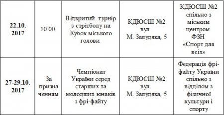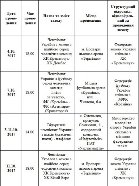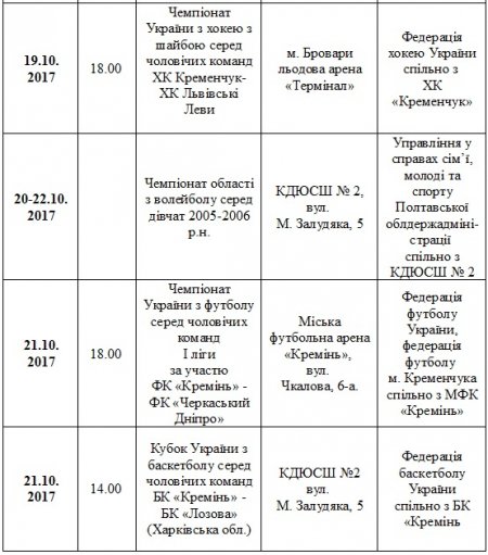 План спортивних заходів у Кременчуці. Жовтень