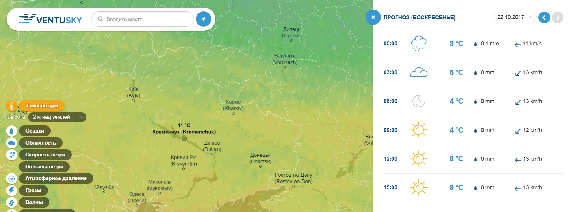 По прогнозу Gismeteo, в субботу, 21 октября, в Кременчуге на протяжении всего дня будет стоять облачная погода. Сильный дождь будет ближе к ночи и закончиться лишь к утру воскресенья, 22 октября. Не стоит рассчитывать на температуру воздуха выше +13ºС.