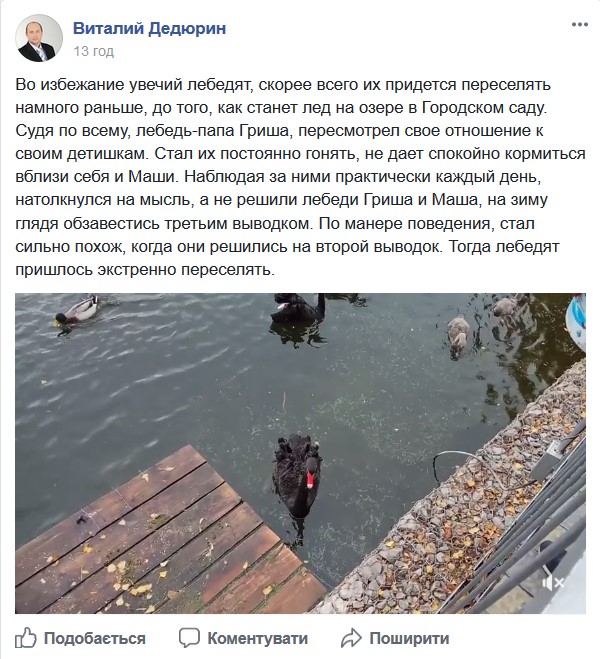 25 октября директор КП «Городской сад» Виталий Дедюрин в Facebook предсказал очередное пополнение лебединой семьи. Третье в этом году.
