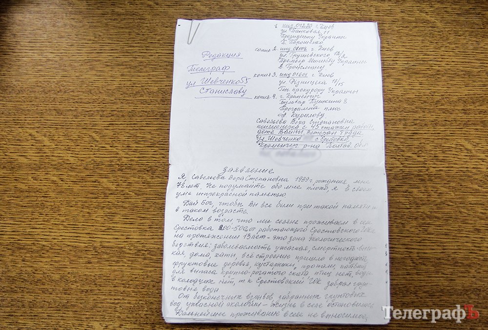 Жители Ерестовки передали «Телеграфу» копию письма, отправленного ими премьер-министру Украины Владимиру Гройсману. В письме 16 подписей, написано оно 78-летней Верой Савельевой. Жители села просят премьера защитить их, помочь с переселением и получением компенсации за разрушение жилых домов, гибель деревьев и тяжелые условия жизни.