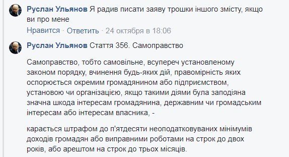 Относительно заявления городского головы разгорелась дискуссия в Фейсбук. Депутат горсовета и советник мэра по юридическим вопросам Руслан Ульянов написал, что советовал (мэру) писать заявление в ином ключе: на самоуправство, ст. 356 Уголовного кодекса.