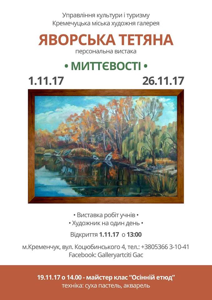 Де: в Кременчуцькій міській художній галереї (вул.Коцюбинського, 4)