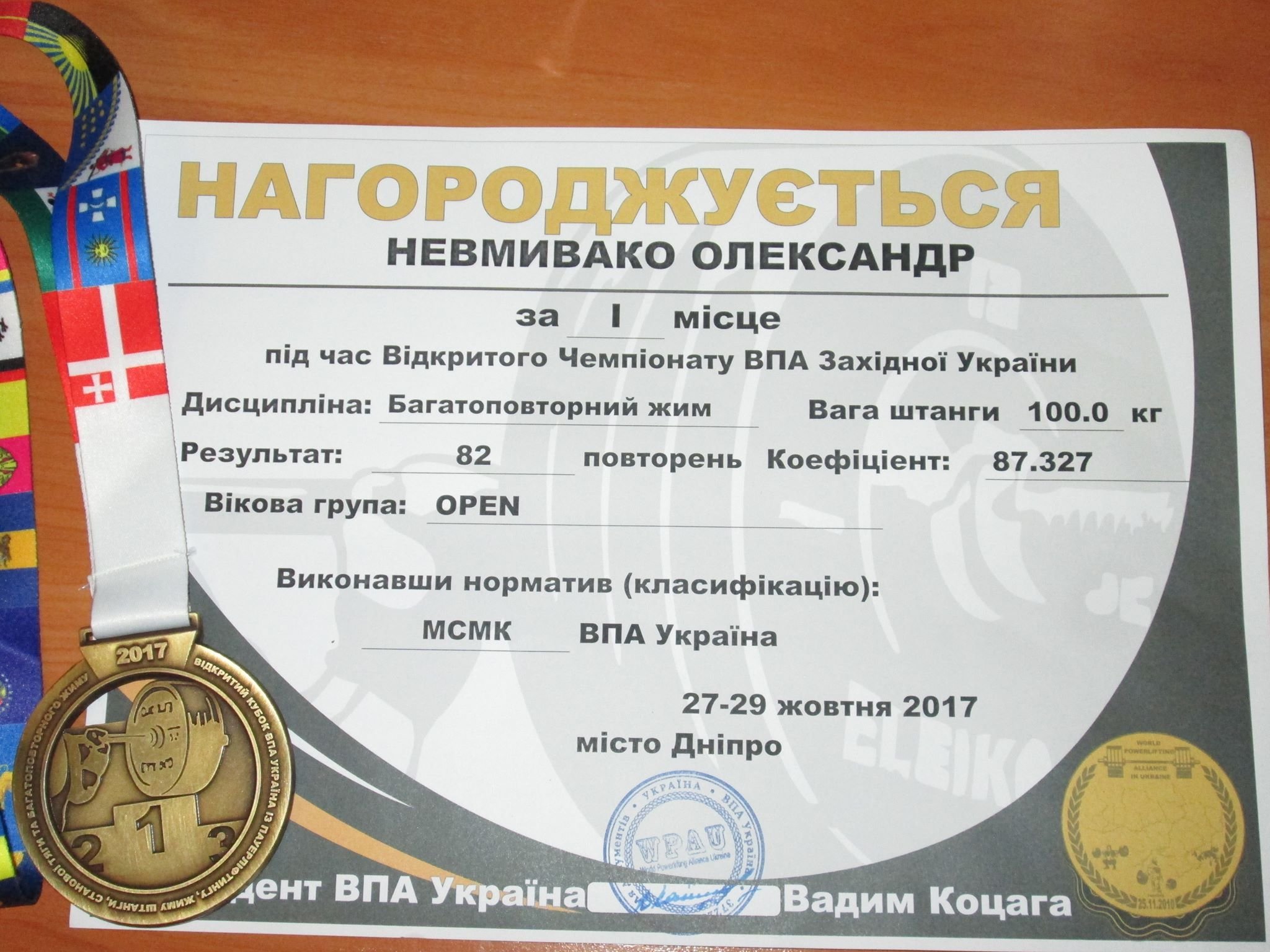 Олександр Невмивако встановив новий рекорд з результатом 82 підйоми штанги 100 кг, цим самим залишивши суперників далеко позаду.