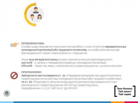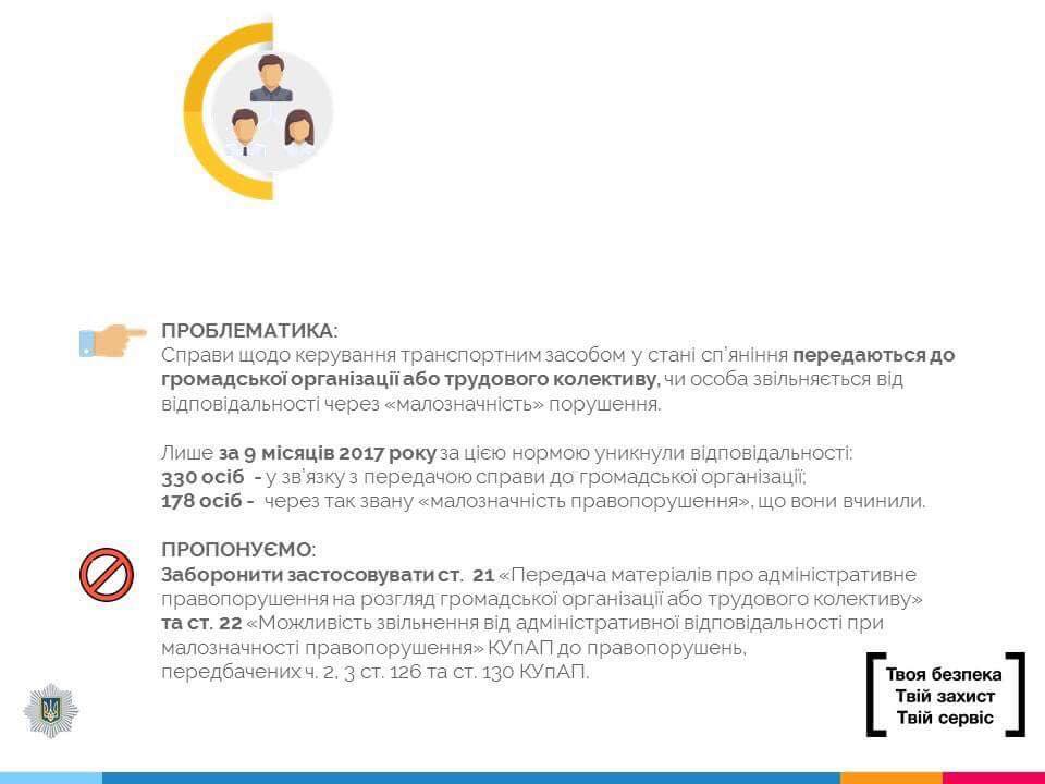 - Покончить с идиотской ситуацией, когда патрульные и суд лишают водителя-пьяницу прав за вождение в нетрезвом виде, а он усмехаясь ездит без прав. Штраф за вождение без прав сейчас – 512 гривен. Предлагается повысить его до 40800 гривен.