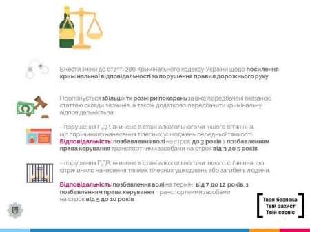 - Ужесточение ответственность за ДТП совершенным в состоянии алкогольного или другого опьянения, что причинило телесные повреждения средней тяжести до 3-х лет лишения свободы.