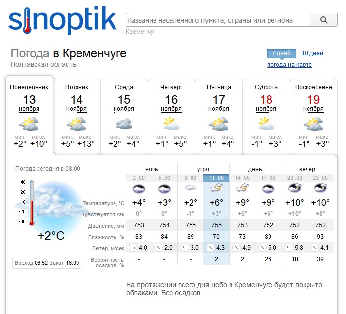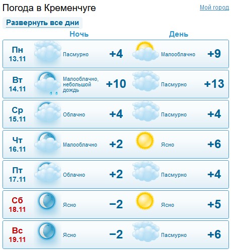Ще прохолоднішу погоду з морозами до -2ºС обіцяє кременчужанам Gismeteo.
