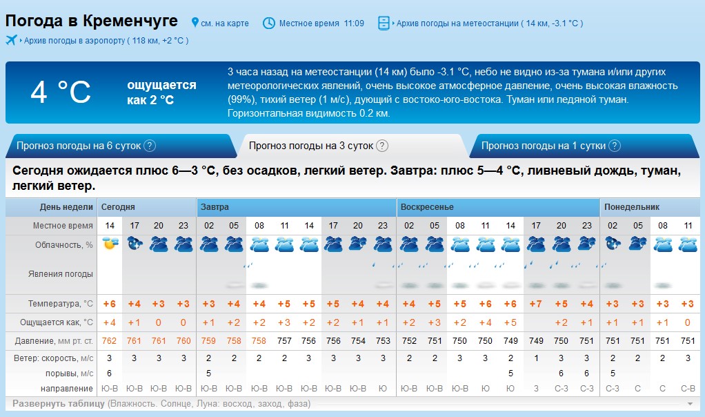 Rp5 предупреждает кременчужан о том, что в суббота, 18 ноября, начнется с лёгкого тумана и небольшого дождика. Весь остальной день будет сухим. Целый день в воскресенье, 19 ноября, будет лить сильный дождь и стоять густой туман с видимостью меньше 1 км. Температура воздуха будет держаться на уровне +3...+7ºС.