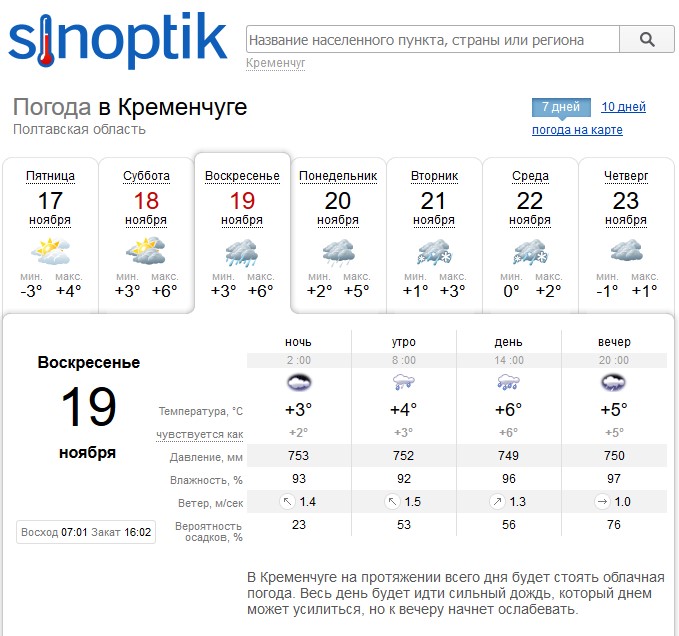 Gismeteo предупреждает кременчужан о небольшом дожде днем субботы, 18 ноября. В воскресенье, 19 ноября, сильный дождь будет лить весь день. Не стоит рассчитывать на температуру воздуха ниже +2ºС и выше +6ºС.