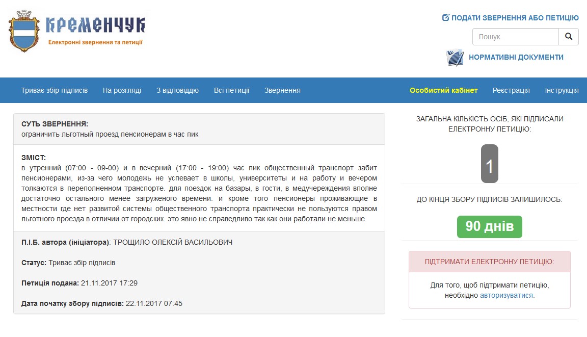 22 ноября на сервисе электронных петиций мэрии появилось новое обращение к мэру Кременчуга Виталию Малецкому с просьбой ограничить льготный проезд пенсионерам в час пик. Инициировал сбор подписей под таким предложением Алексей Трощило.