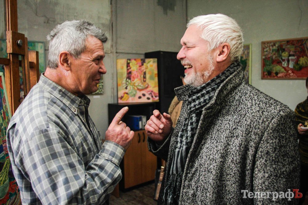 Художник Кобеляцкий (слева) и посетитель выставки радостно обсуждают достоиства представленных на выставке работ
