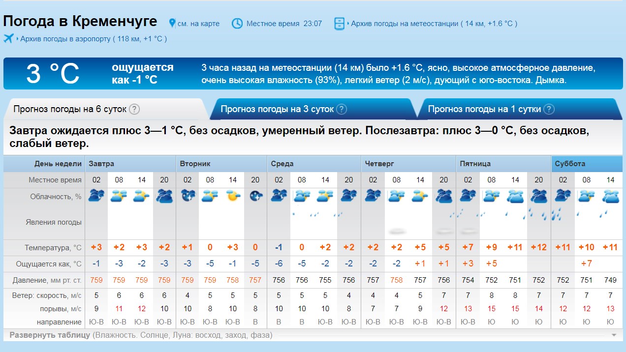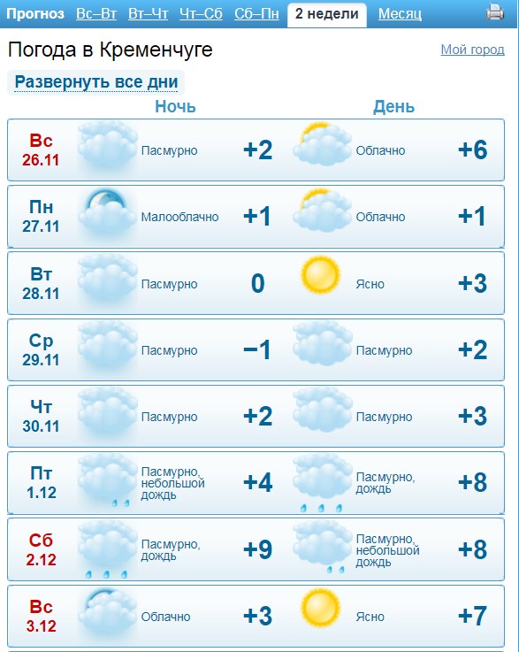Gismeteo обіцяє кременчужанам суху та похмуру погоду щодня, крім вівторка, 28 листопада, коли день буде ясним. У середу, 29 листопада, стовпчики термометрів опустяться до -1ºС, а далі поступово теплішатиме і, під кінець тижня, температура повітря сягне +8ºС. Дощитиме у п'ятницю-суботу, 1-2 грудня.