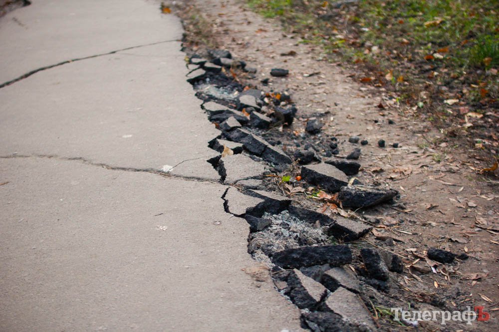 Во время уборки трактором опавших листьев, тракторист проехался по асфальтной дорожке, разрушив её в некоторых местах.