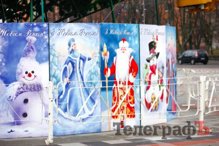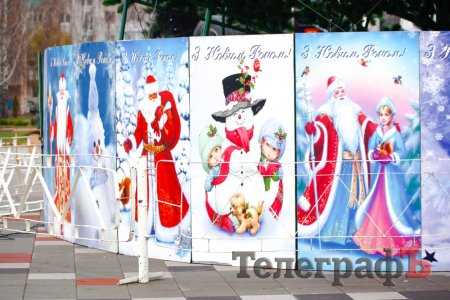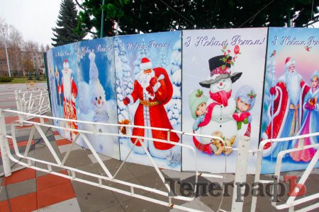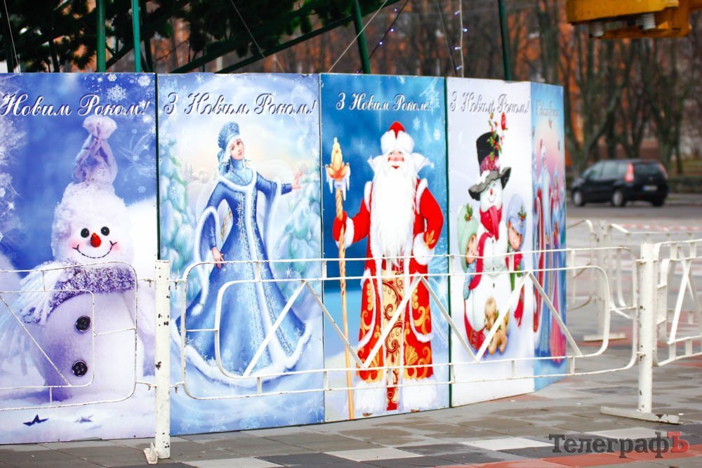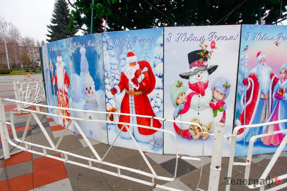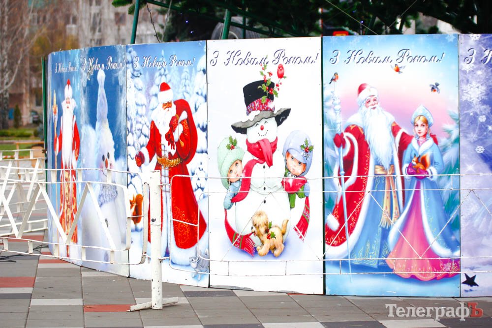 28 ноября ёлку окружили праздничным забором с изображением Дедов Морозов, Снегурочек и снеговиков.