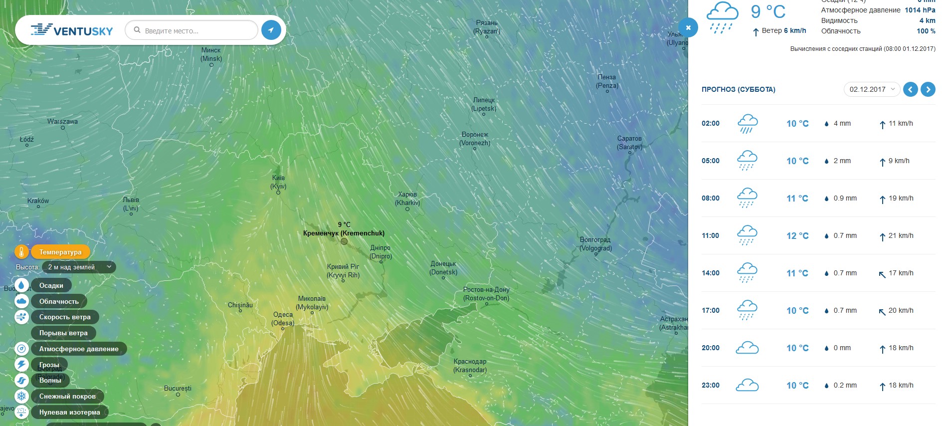 В субботу, 2 декабря, Ventusky прогнозирует облачный денёк. Весь день с неба будет падать дождь. Температура воздуха достигнет +12ºС.