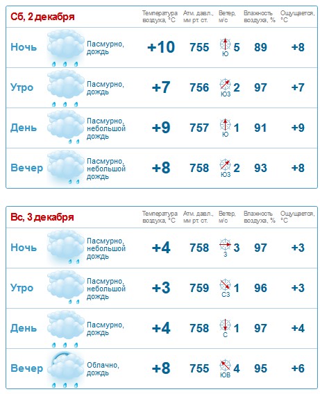 Rp5 прогнозирует, что в субботу, 2 декабря, и в воскресенье, 3 декабря, пройдут ливни. В первой половине дня город окутает густой туман, который после обеда превратиться в лёгкую дымку. В субботу будет немного ветрено - до 11 м/с.