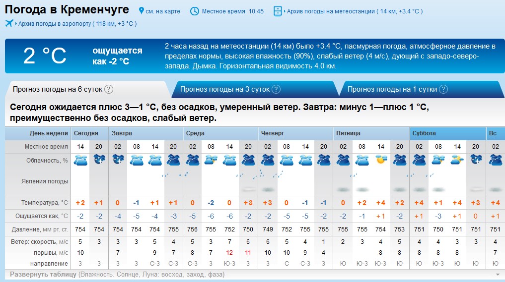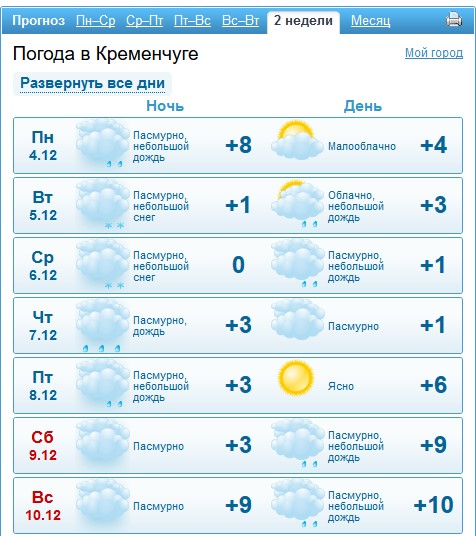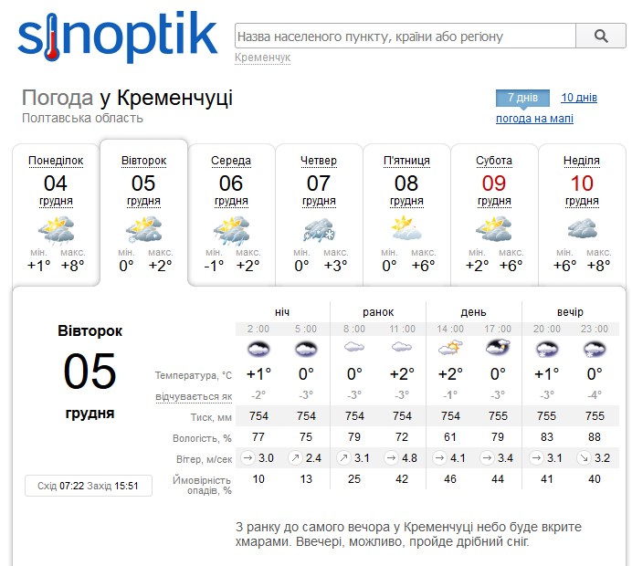 Gismeteo обіцяє кременчужанам опади щодня. Дрібний сніг йтиме вночі у вівторок, 5 грудня, та середу, 6 грудня. Дощитиме щодня. У середу, 5 грудня, стовпчики термометрів опустяться до 0ºС, а далі поступово теплішатиме і, під кінець тижня, температура повітря сягне +10ºС.
