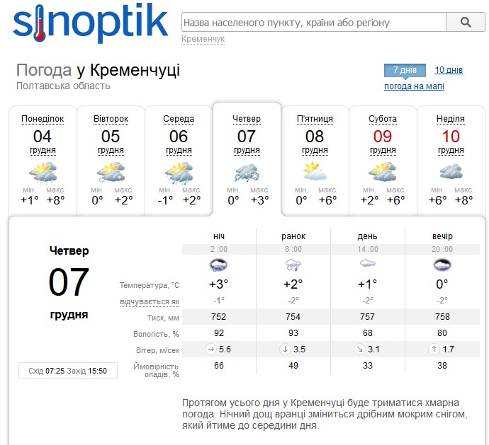 А на rp5 попереджають, що сніжитиме лише в ніч з віторка, 5 грудня, на середу, 6 грудня. В усі інші дні варто чекати дощу. З четверга, 7 грудня, по неділю, 10 грудня, місто огорне густий туман з видимістю менше 1 км. У середу, 6 грудня, здійметься вітрюган з поривами до 12 м/с. Морозів до -2ºС слід чекати з вівторка, 5 грудня, по четвер, 7 грудня, включно.