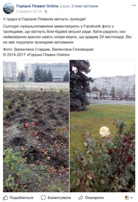 2 грудня плавнівці ділились у Facebook фотографіями троянд, які розквітли на квітниках у центрі міста.