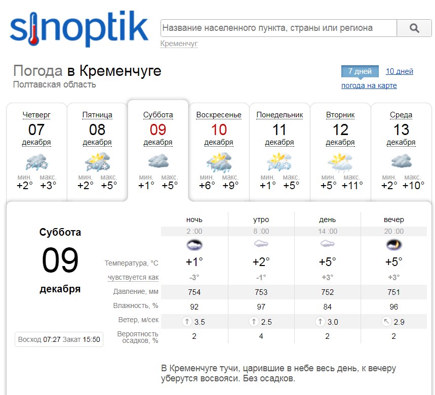 Хмурую погоду на весь викенд кременчужанам прогнозирует и Gismeteo. Дождь возможен утром и вечером воскресенья, 10 декабря. На температуру воздуха ниже +1ºС и выше +11ºС рассчитывать не стоит.