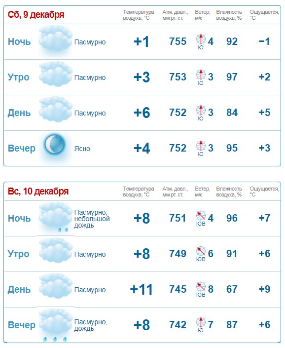 Rp5 прогнозирует, что в субботу, 9 декабря, и в воскресенье, 10 декабря, на город спустится туман с видимостью меньше 1 км. В воскресенье возможен небольшой дождь и сильный ветер с порывами до 18 м/с.