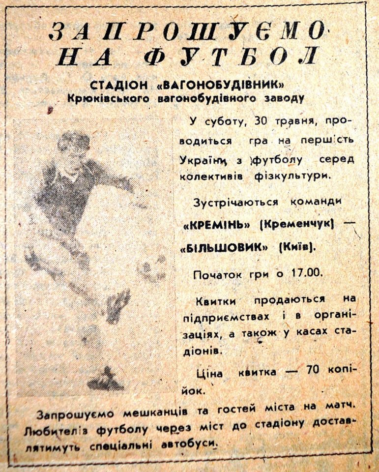 В цьому ж році 1 вересня на стадіоні Крюківського вагонобудівного заводу відбулися всесоюзні змагання футбольних команд низових колективів ДСТ «Авангард». Між собою зіграли команди м. Орська і Крюкова. Наступного дня між собою зіграли Крюків і Челябінськ (10:2 на користь крюків`ян).