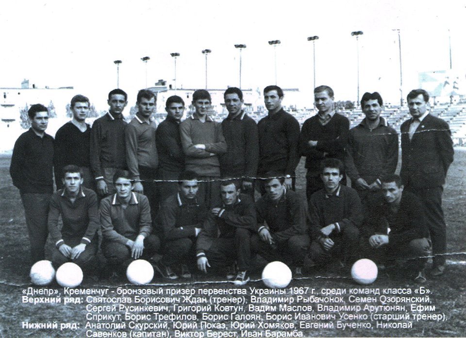Півстоліття тому, у 1967 році, за статистикою, у Кременчуці грали в футбол понад 4000 чоловік. 1967 рік став знаковим і урожайним для кременчужан. Футболісти порадували вболівальників чудовою грою. Так, у фіналі республіканських змагань, який пройшов у Херсоні, не програвши жодного матчу (три перемоги і дві нічиї), кременчужани лише за різницею забитих і пропущених м’ячів поступилися дніпропетровській команді і посіли друге місце. Кращим захисником турніру було визнано кременчужанина Миколу Савенкова. Фахівці також високо відзначили гру в півзахисті гравців «Дніпра» Євгена Бученка і Бориса Трефілова.