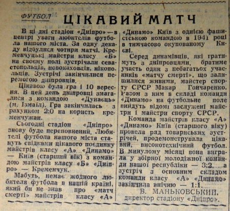 Гра відбулася 12 вересня. Один гравець з цієї команди брав участь у вікопомному «матчі смерті» 1941 року в тимчасово окупованому Києві! Це був майстер спорту СРСР Макар Гончаренко. |