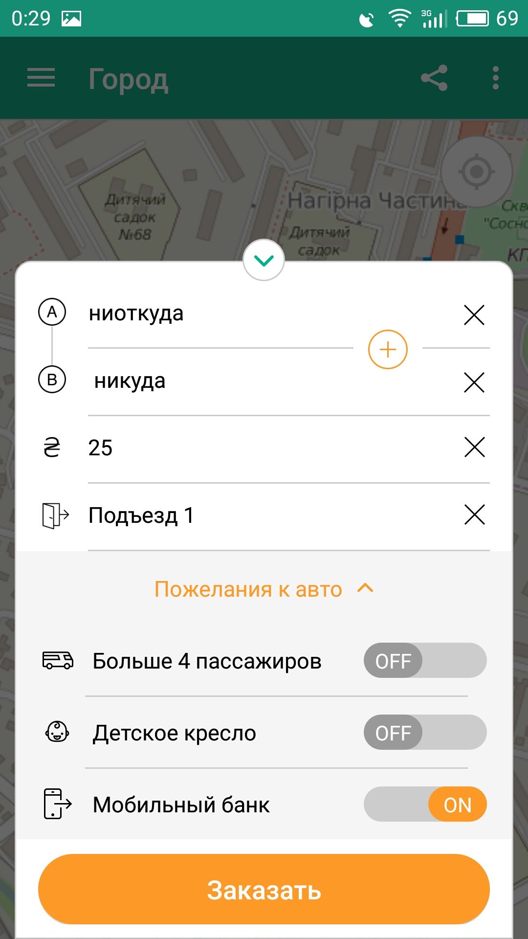 Щоб замовити авто достатньо написати маршрут: «Звідки» – «Куди» (з номером будинку) і запропонувати бажану «Ціну» за поїздку (в межах розумного). У «Коментарях» потрібно вказати під’їзд, звідки вас забрати або додаткову інформацію для водіїв.