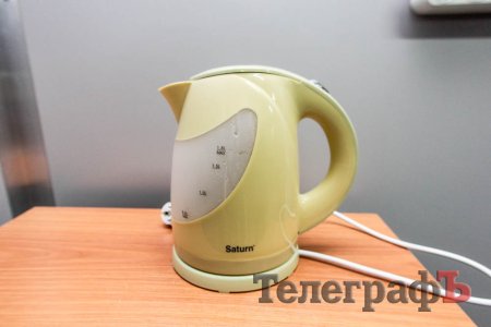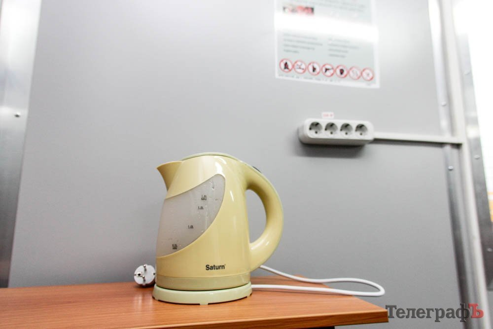 Внутри три стола, лавки, маленький столик. Все прикручено к полу, чтобы посетители не унесли с собой. Есть электрочайник, которым можно воспользоваться в любое время. Обогревается помещение электроконвектором.