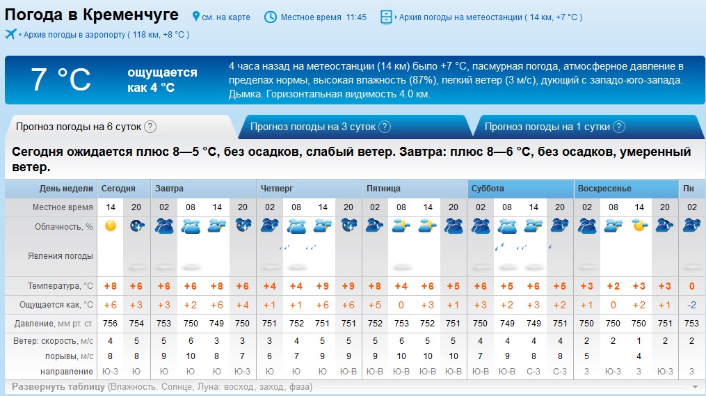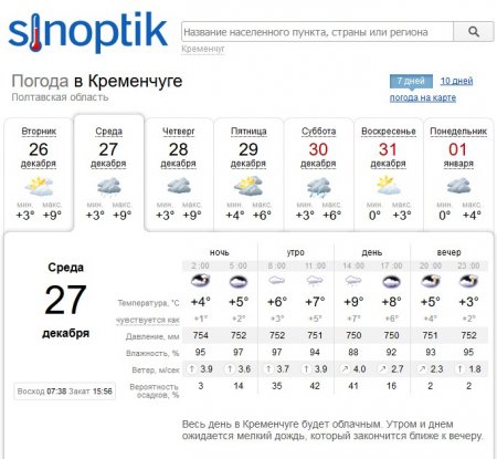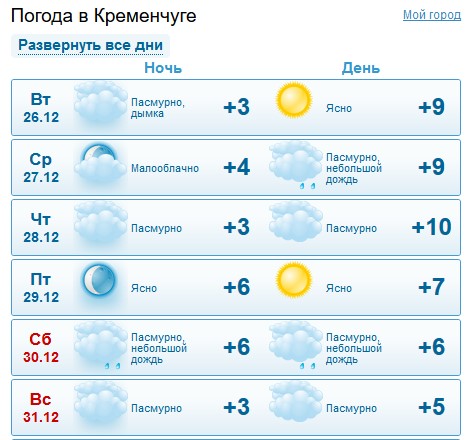 На rp5 кременчужан попереджають що ранок кожного дня на цьому тижні починатиметься з серпанку. Погода буде переважно сухою. Невеликий дощик варто чекати лише у середу, 27 грудня, та суботу, 30 грудня. Температура повітря триматиметься на рівні +2оС...+9оС.