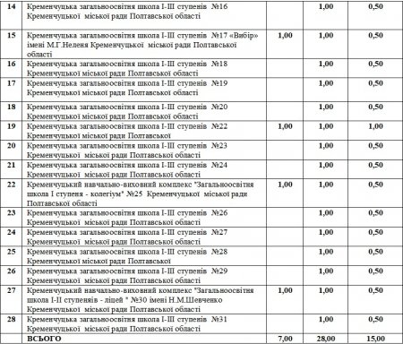 В кременчугских школах ввели штатные единицы медработников. Соответствующее решение принял 29 декабря исполком Кременчугского горсовета. По словам начальника депатрамента образования Геннадия Москалика, штатные единицы вводятся согласно с требованиями законодательства. Количество ставок зависит от количества учащихся. В среднем, вводится 1 ставка медсестры и 0,5 ставки медсестры диетического питания. В некоторых школах также предусмотрены ставки врачей-педиатров. Директорам учебных заведений разрешено на своё усмотрение, в зависимости от потребностей, менять штат.