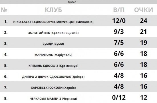 У першій групі беззаперечним лідером є Ніко-баскет. Миколаївці виграли всі 12 матчів – єдині в дивізіоні. Минулорічний лідер першого етапу Золотий Вік з Кропивницького йде другим – 3 поразки. Також шанси на плей-оф мають Маріуполь та Кремінь. Складніше становище у Дніпра-2 та Харківських Соколів – їхні шанси на плей-оф більш теоретичні.