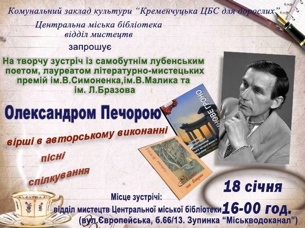 Запрошуємо на зустріч з Олександром Печорою – поетом, пісняром, гумористом. Наш гість з Лубен – член Полтавської спілки літераторів, Національної спілки журналістів України. Автор поетичних збірок, учасник альманахів письменників Полтавщини, людина неординарна і багатогранна. Завітайте до відділу мистецтв ЦМБ, послухайте майстернє художнє слово, поспілкуйтесь з поетом! Вхід до нас вільний.