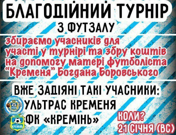 Вболівальники збираються провести благодійний турнір з футзалу, щоб зібрати кошти на допомогу мамі Богдана. Для участі команди необхідно 5 чоловік та благодійний внесок 250 грн (все це благодійно, хто скільки зможе). На участь в змаганнях погодилися футболісти «Кременя» та ультрас. Змагання відбудуться 21 січня, місце проведення уточнюється.