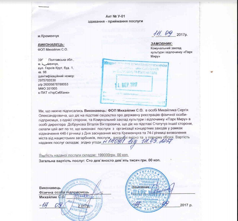 Нагадаємо, має місце поділ предмету закупівлі — організації концертних заходів між трьома комунальними закладами культури – «Міський парк культури і відпочинку «Придніпровський», «Парк Миру» та «Парк Крюківський». Кожен з парків отримав трохи менше 200 тисяч гривень — тобто саме такі суми, на які можна не проводити тендери. А всі три замовлення отримав ФОП Михайлик. При цьому кошти були використані всупереч бюджетним призначенням. Акти виконаних робіт і договори підписані задовго до свят. І при цьому послуги не конкретизовані. Ось, наприклад, акт виконаних робіт, який підписав керівник парку Мира від 14.09.17 р. «Послуги з організації концертних заходів» - а що саме туди входило, можна лише здогадуватися. Але гроші перераховані.
