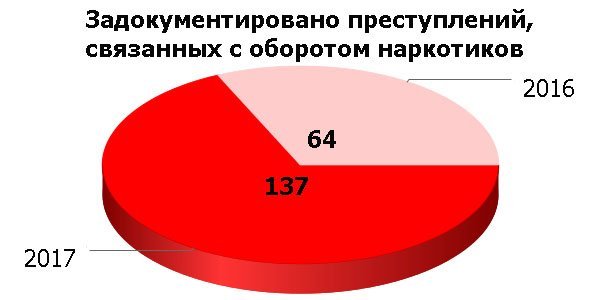 Что касается наркопреступлений, их в 2017 году задокументировали 137, 57 из них связаны со сбытом. Это более чем в два раза больше, нежели в 2016 году. В количественном соотношении больше всего изъяли марихуаны – 1899 грамм. На втором месте опий ацетилированый (ширка) – 386 мл, а на третем – психотропные вещества, общим весом почти 99 грамм.