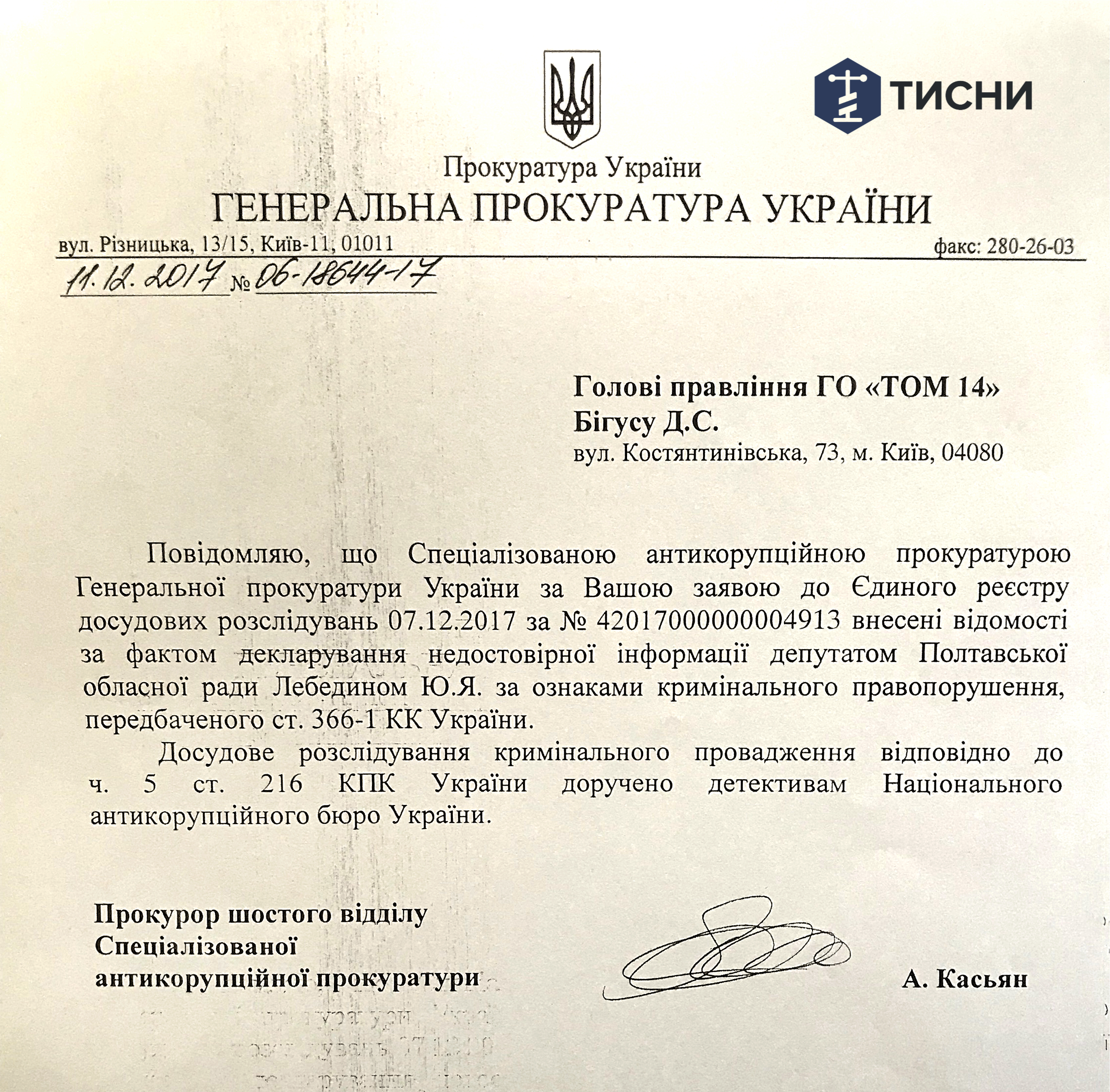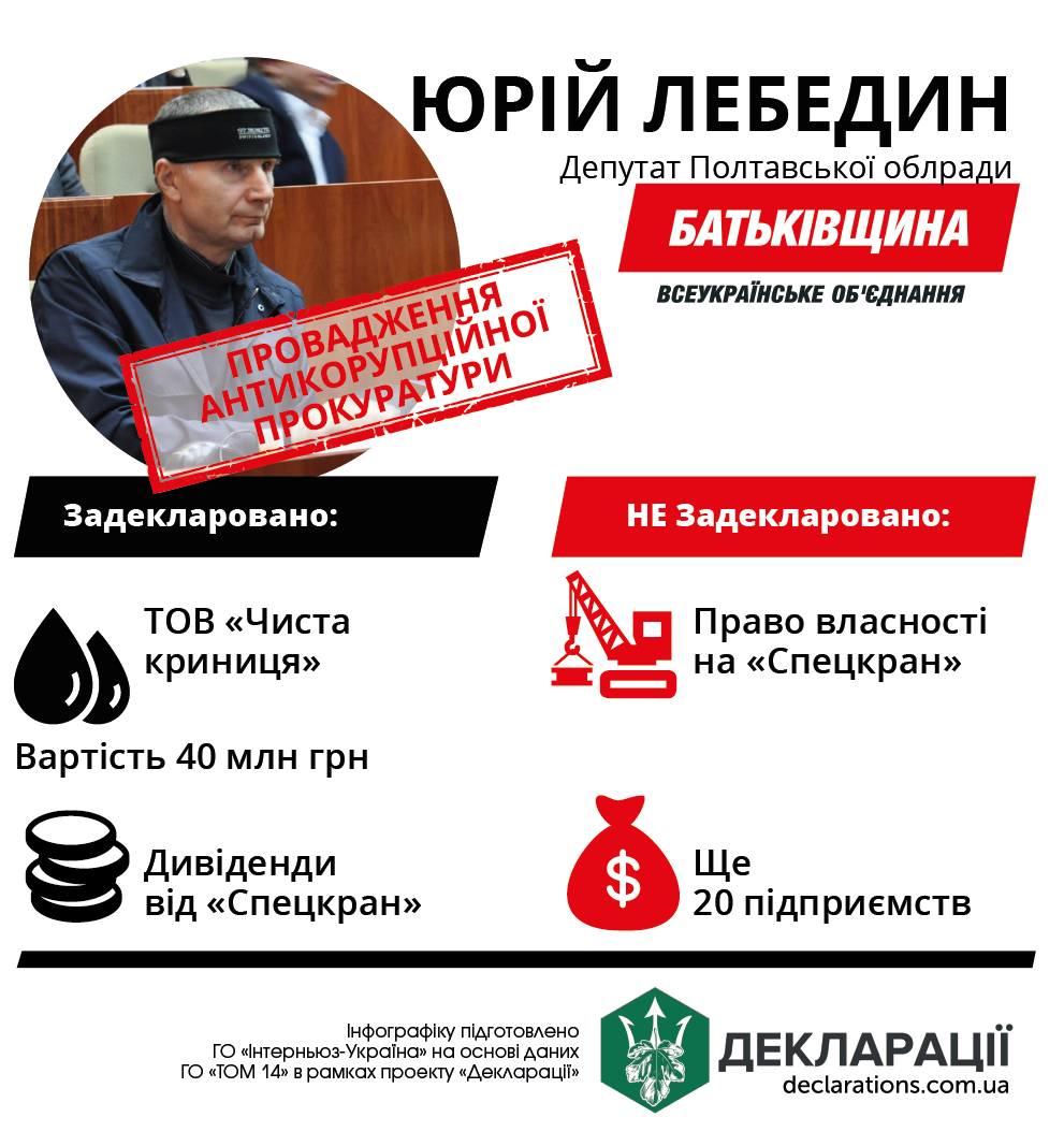 Спеціалізована антикорупційна прокуратура розпочала справу щодо депутата Полтавської облради Юрія Лебедина. Справу розпочали після звернення юристів проекту «Тисни» (Bihus.Info). Чиновника підозрюють в декларуванні недостовірної інформації.