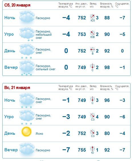 Rp5 прогнозирует, что в субботу, 20 января, на город упадёт туман с видимостью меньше 1 км. К вечеру он станет замерзать. Днём пойдет мелкий дождь, который к вечеру превратится в снег. Ожидаемая температура воздуха от 0°C до -2°C. В воскресенье, 21 января, снегбудет идти в первой половине дня. Далее будет сухо и солнечно. Столбики термометров опустятся до -3°C.