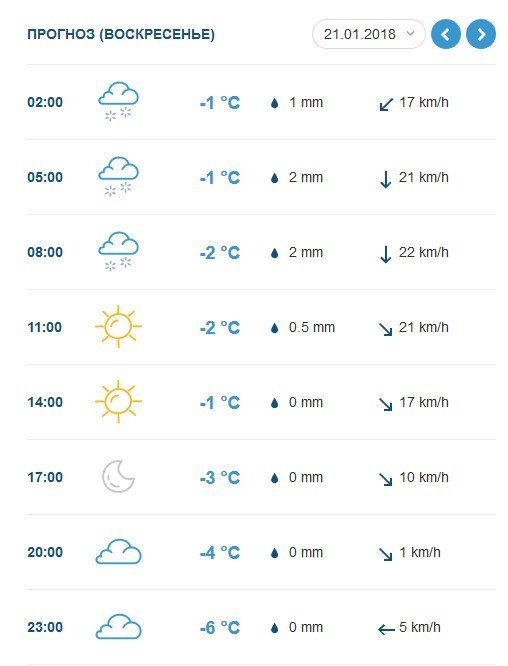 В воскресенье, 21 января, Ventusky прогнозирует солнечный день, который начнётся снегопадом. Прогнозируют мороз от -1°C до -6°C.