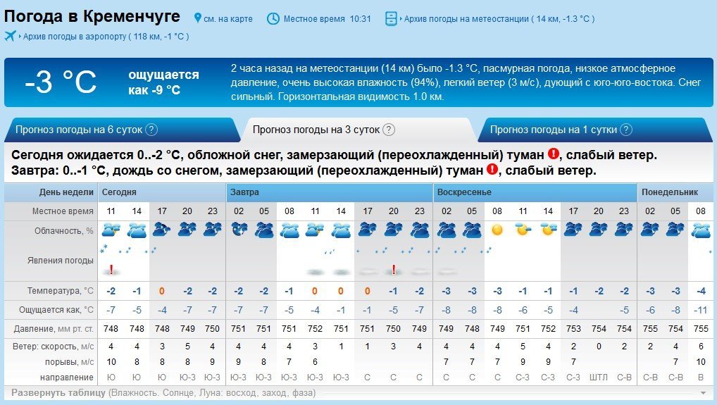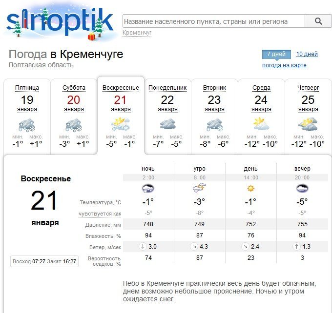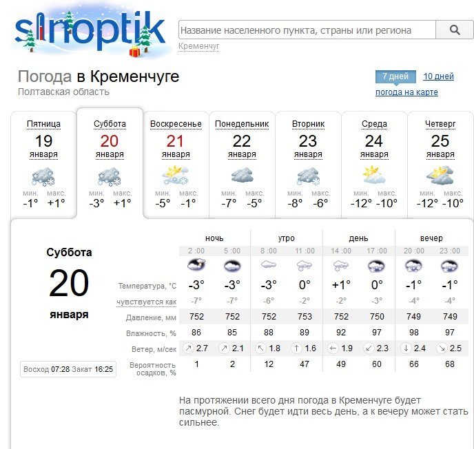 Снежную и морозную погоду на весь викенд кременчужанам прогнозирует и Gismeteo. На температуру воздуха ниже -7°C и выше 0°C рассчитывать не стоит.