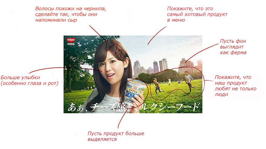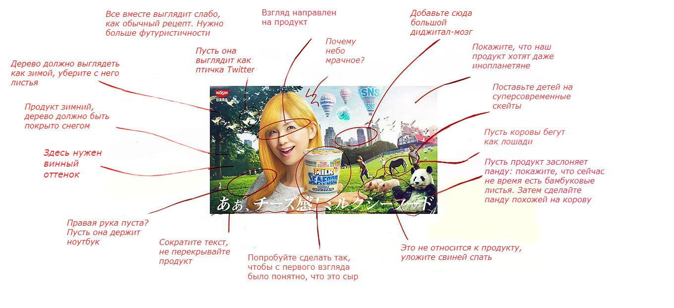 Японский производитель лапши быстрого приготовления Nissin Cup Noodles показал, во что мог бы превратиться дизайн рекламного объявления для их продукта. Они представили стандартную ситуацию, когда клиент недоволен первым вариантом макета и передает исполнителям множество правок, которые нужно внести. Однако дизайнеры не спорят, а в точности исполняют все пожелания…