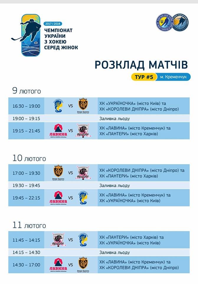5 тур стартує о 16.30 з гри київської «Україночки» та «Королев Дніпра», а вже о 19.45 на лід вийдуть кременчужанки з команди «Лавина», суперницями наших дівчат будуть харківські «Пантери».