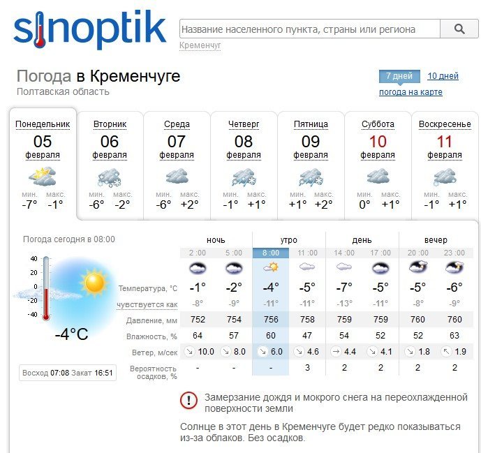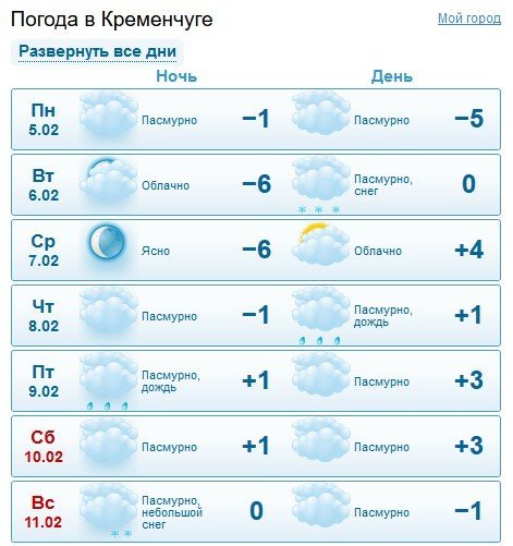 За прогнозом Gismeteo, морози не щипатимуть кременчужан лише у п’ятницю, 9 лютого, та суботу, 10 лютого, коли стовпчики термометрів не опустяться нижче +1°C. В інші дні, температура повітря коливатиметься від -6°C до 0°C. У вівторок, 6 лютого, та неділю, 11 лютого, прогнозують сніг, а у четвер та п’ятницю, 8-9 лютого, – дощ.
