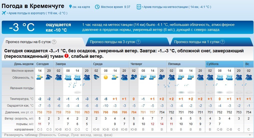 На rp5 кременчужан попереджають, що у понеділок, 5 лютого, та четвер, 8 лютого, погода буде вітряною з поривами до 14 м/с. У вівторок, 6 лютого, та суботу-неділю, 10-11 лютого, йтиме сніг. Дощитиме в ніч з четверга, 8 лютого, на п’ятницю, 9 лютого. У п’ятницю та суботу на місто впаде густий туман з видимістю менше 1 км. Температура повітря триматиметься на рівні -5°C…+2°C.