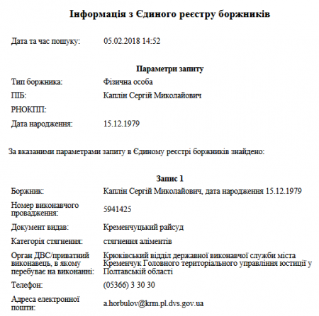 Сергій Каплін потрапив через стягнення аліментів, про це засвідчує інформація з реєстру з посиланням на Кременчуцький районний суд.