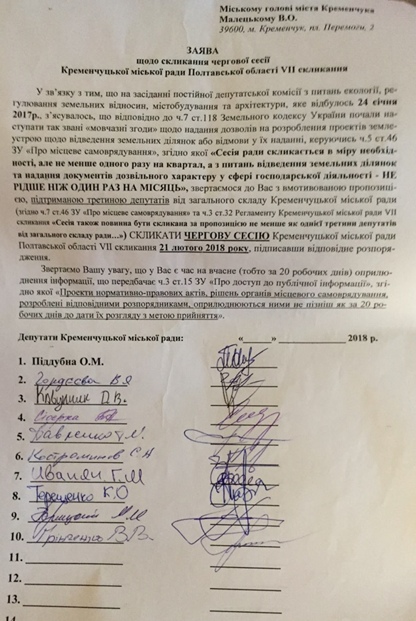 На сегодня Оксана Пидубная собрала 10 подписей для созыва сессии. Не хватает еще 4. Обращение о созыве сессии подписали, кроме самой Пиддубной, Валентина Гордеева, Дмитрий Кавунник, Татьяна Сидерка, Анна Павленко, Сергей Костроминов, Геннадий Иванян, Константин Терещенко, Николай Порицкий, Владимир Гринченко.